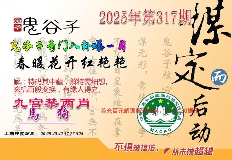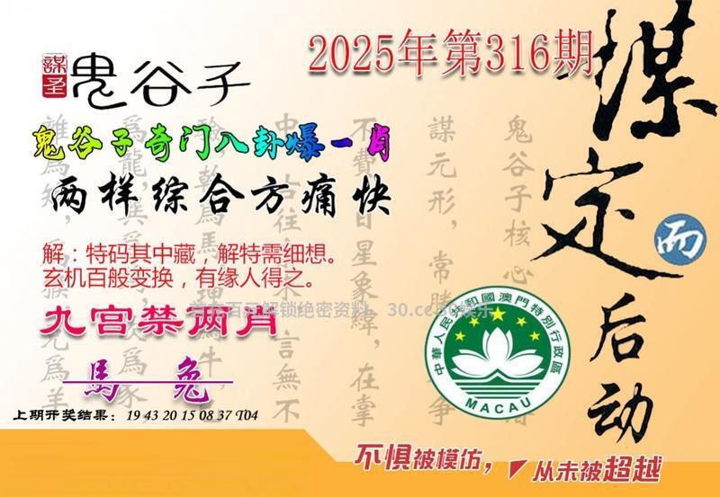 | 320期:澳彩鬼谷子【开:發00】 综合解:资料准备更新中 综合特肖:资料准备更新中 主攻特码:资料准备更新中 |